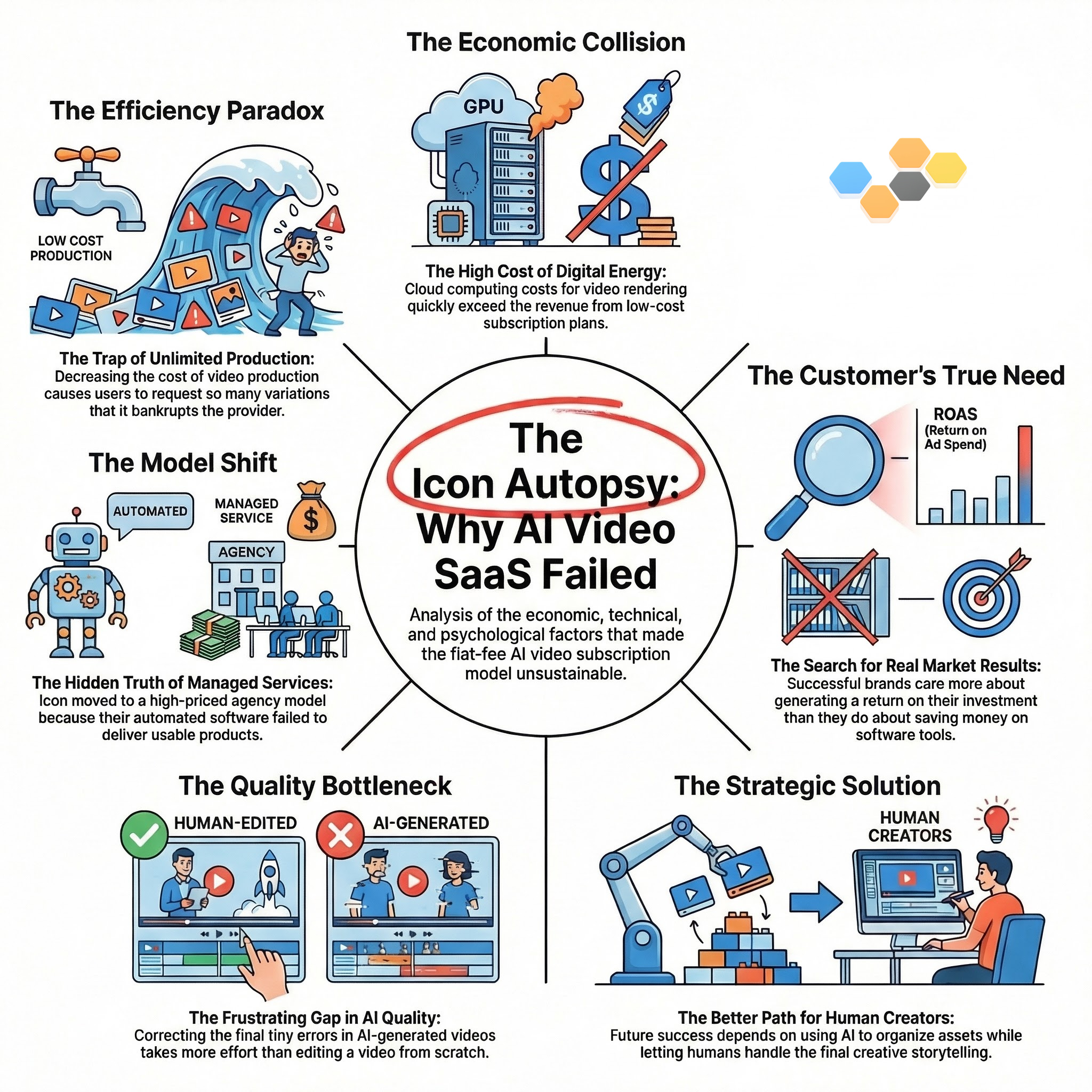 Software scales infinitely; human labor does not. When Icon’s core product failed to deliver on its automated promises, the company was forced to quietly pivot from a high-margin tech platform into a low-margin, high-stress creative agency. This structural collapse was inevitable the moment their algorithm encountered the unpredictable reality of high-performance media buying.