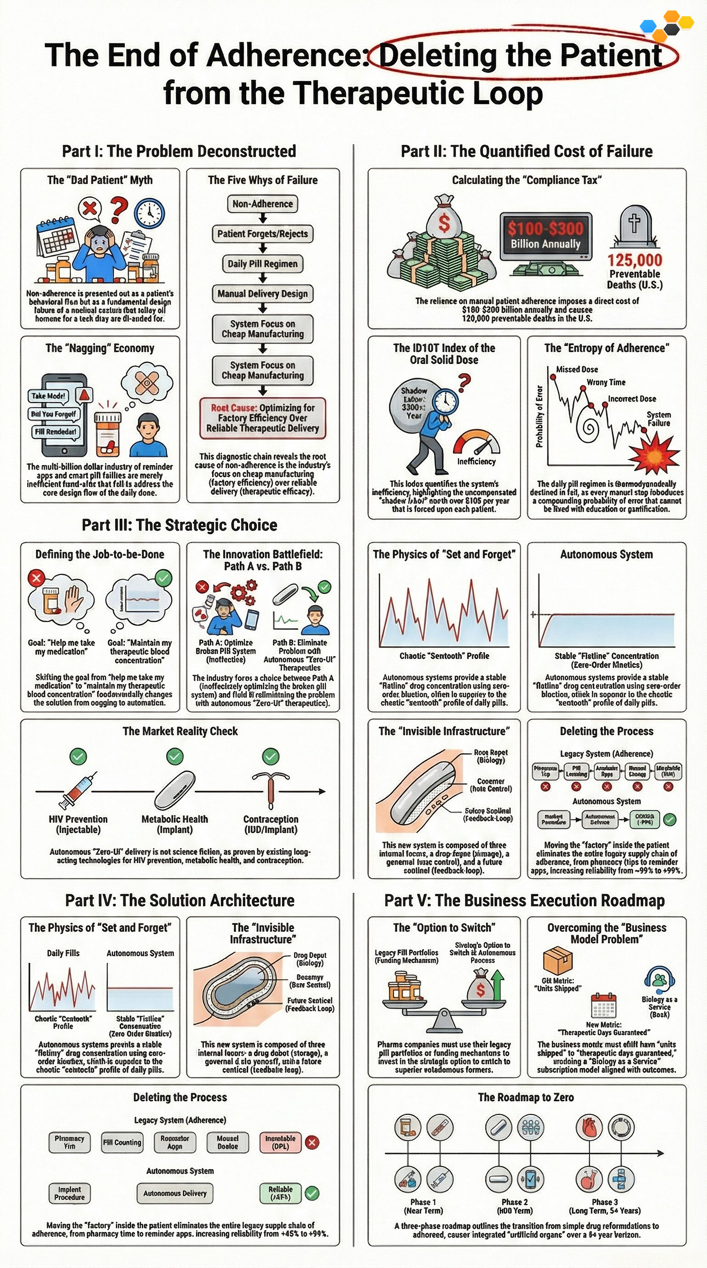 This analysis reveals that “Adherence” is a problem created by the solution itself. We are currently stuck in Path A (Optimization), trying to make “pill swallowing” easier. The First Principles imperative is Path B (Deletion): question the existence of the pill. If the delivery mechanism (the pill) requires a level of consistency that the user (the human) cannot provide, the mechanism must be deleted.