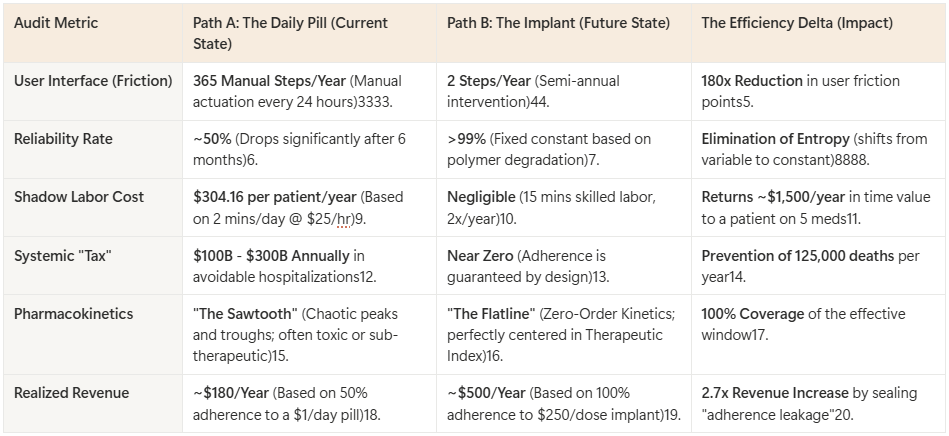The current system essentially imposes a $304 annual labor tax on every patient for every chronic medication they take. If a patient is on 5 medications, they are performing $1,500 worth of uncompensated labor annually to act as a manual servo in the pharma supply chain. By switching to a Long-Acting Injectable (LAI) or Implant that requires intervention only twice a year (15 minutes of L2 Skilled labor), we reduce the failure points by a factor of 180x (365 events vs. 2 events).