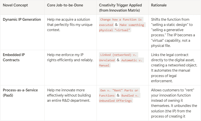 The novel concepts discussed in Part 3 weren't pulled from thin air. They were derived by systematically applying creativity triggers. This table shows their origin.