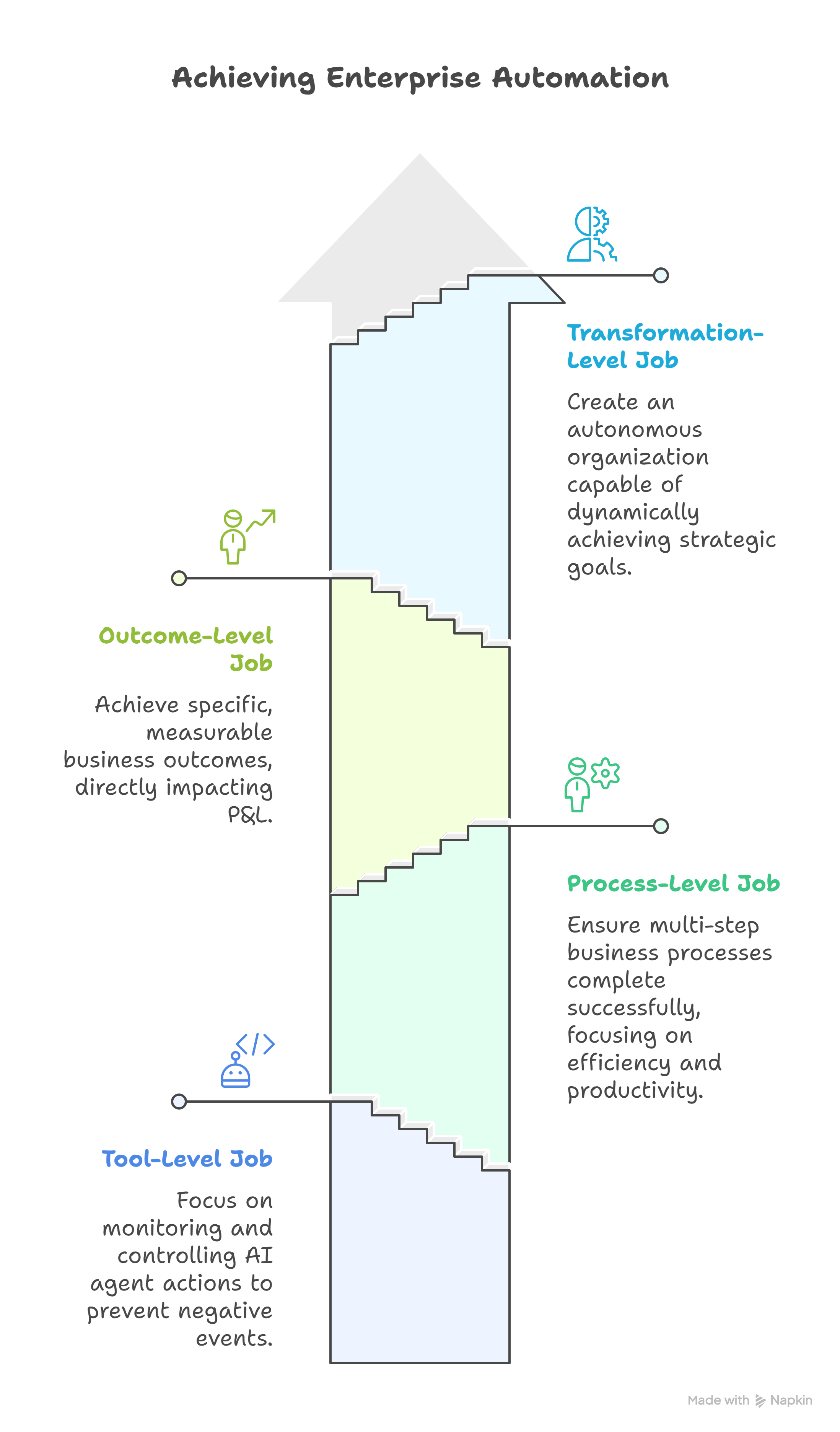 This is the endgame. The job is to build an autonomous organization. A system where strategic goals can be defined at a high level, and the organization itself can assemble the necessary resources and processes to achieve them. The job performer is the CEO, the board, the founder. This isn't just a tool; it's a new way of operating. The value is strategic, unlocking immense enterprise value.