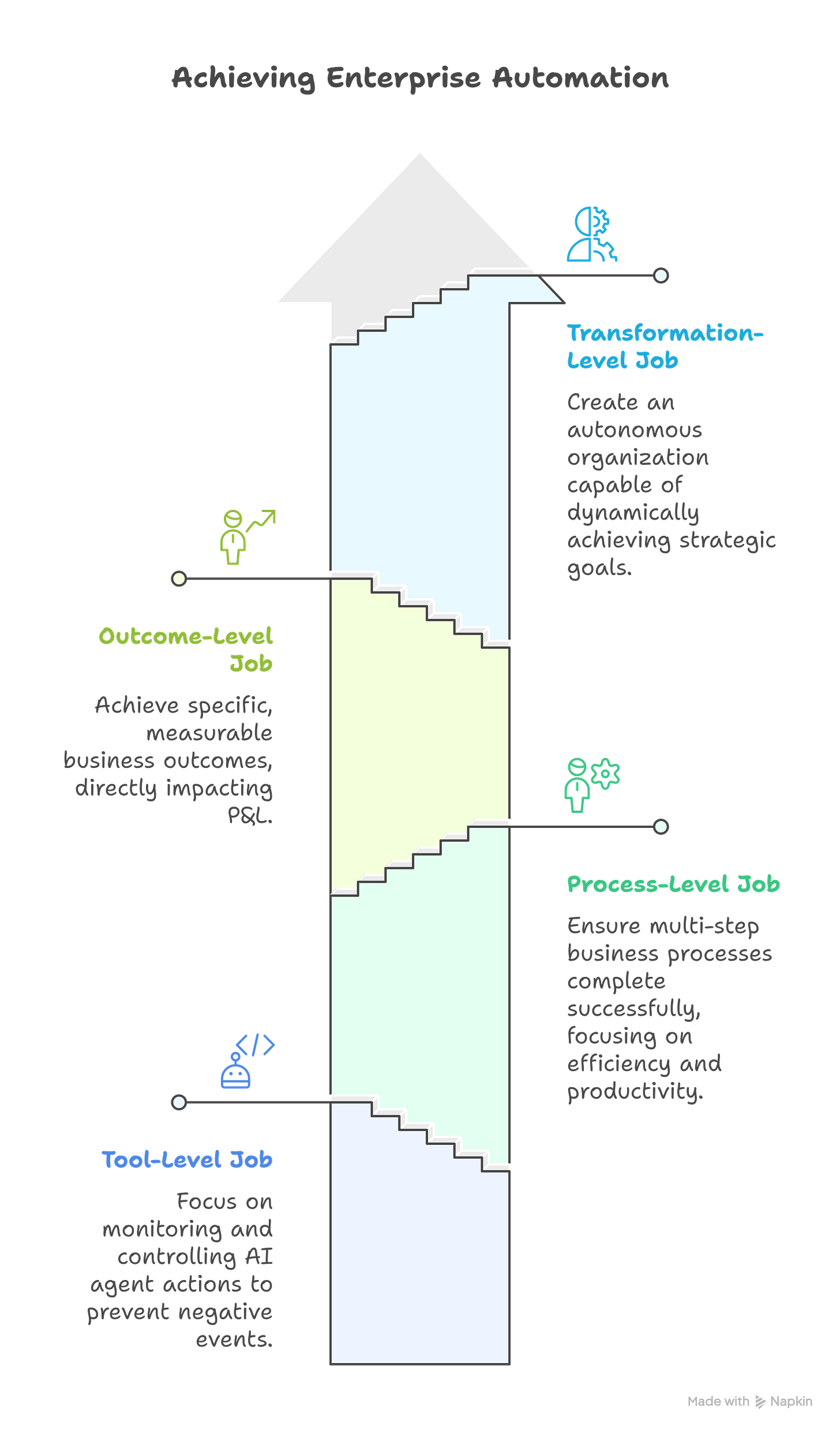 This is a major leap. We're no longer focused on the process, but on the result. The job is to reduce customer support resolution time by 30% or increase lead qualification accuracy to 95%. The job performer is a VP or C-level executive. They are hiring a solution to deliver a specific business result, and they will pay for that result. The value is directly tied to P&L impact.