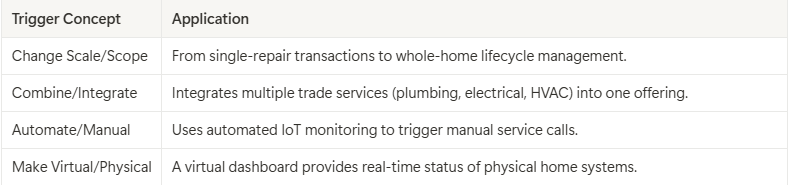 The Novel Solution: A single subscription service that guarantees the outcome of a functional home. For a flat monthly fee, the service proactively monitors systems (using IoT sensors), performs preventative maintenance, and handles all repairs with a dedicated crew. The homeowner is no longer hiring a "plumber"; they are hiring "a home that just works." This shifts the profit model from transactions to a guaranteed outcome.