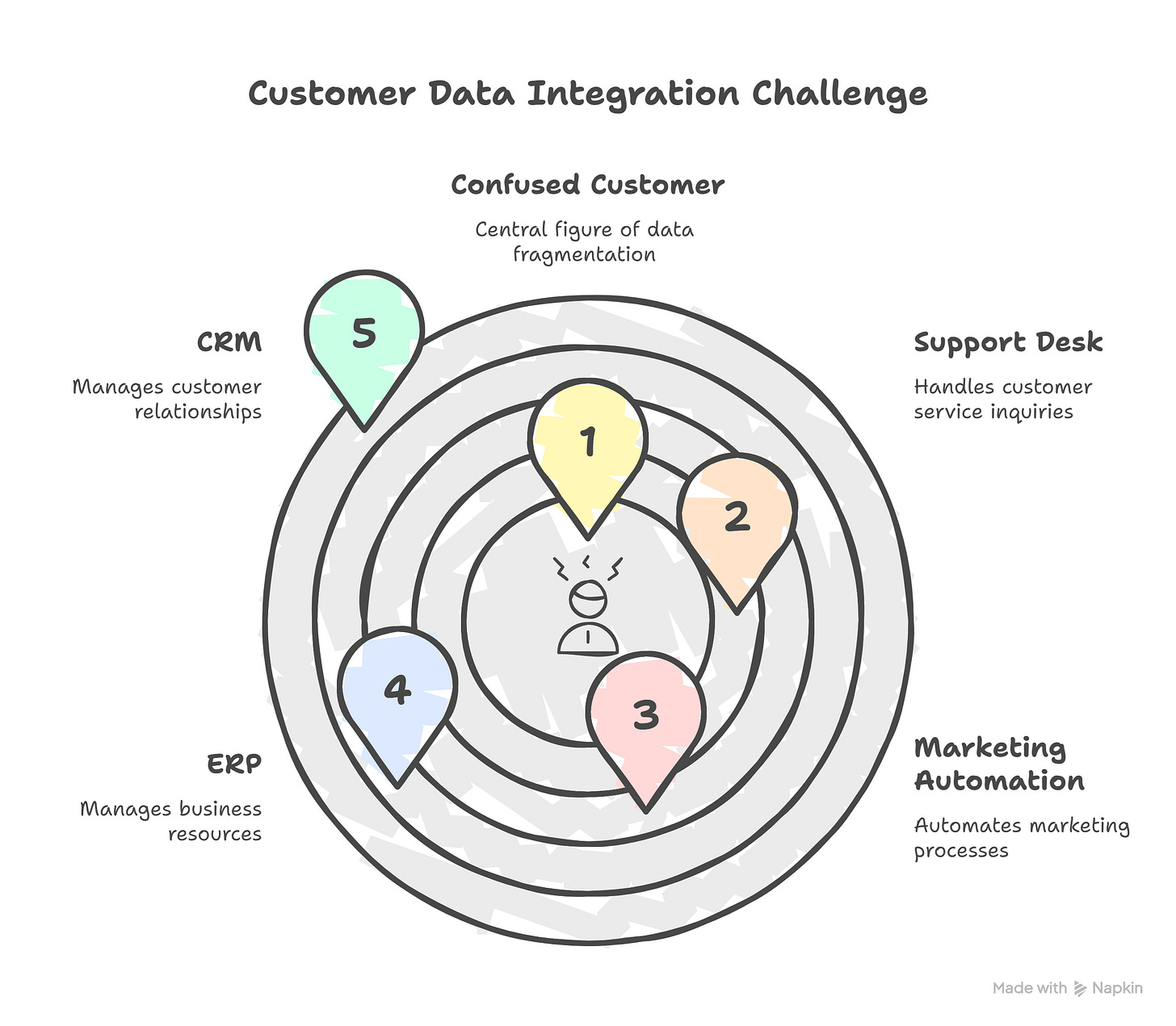 Multiple Systems of Record (SoR): Decades of growth, acquisitions, and departmental tool choices lead to disparate systems (CRM, ERP, marketing clouds, support desks, bespoke databases) holding conflicting identifiers and data fragments for the same customer. Achieving a single source of truth feels impossible.