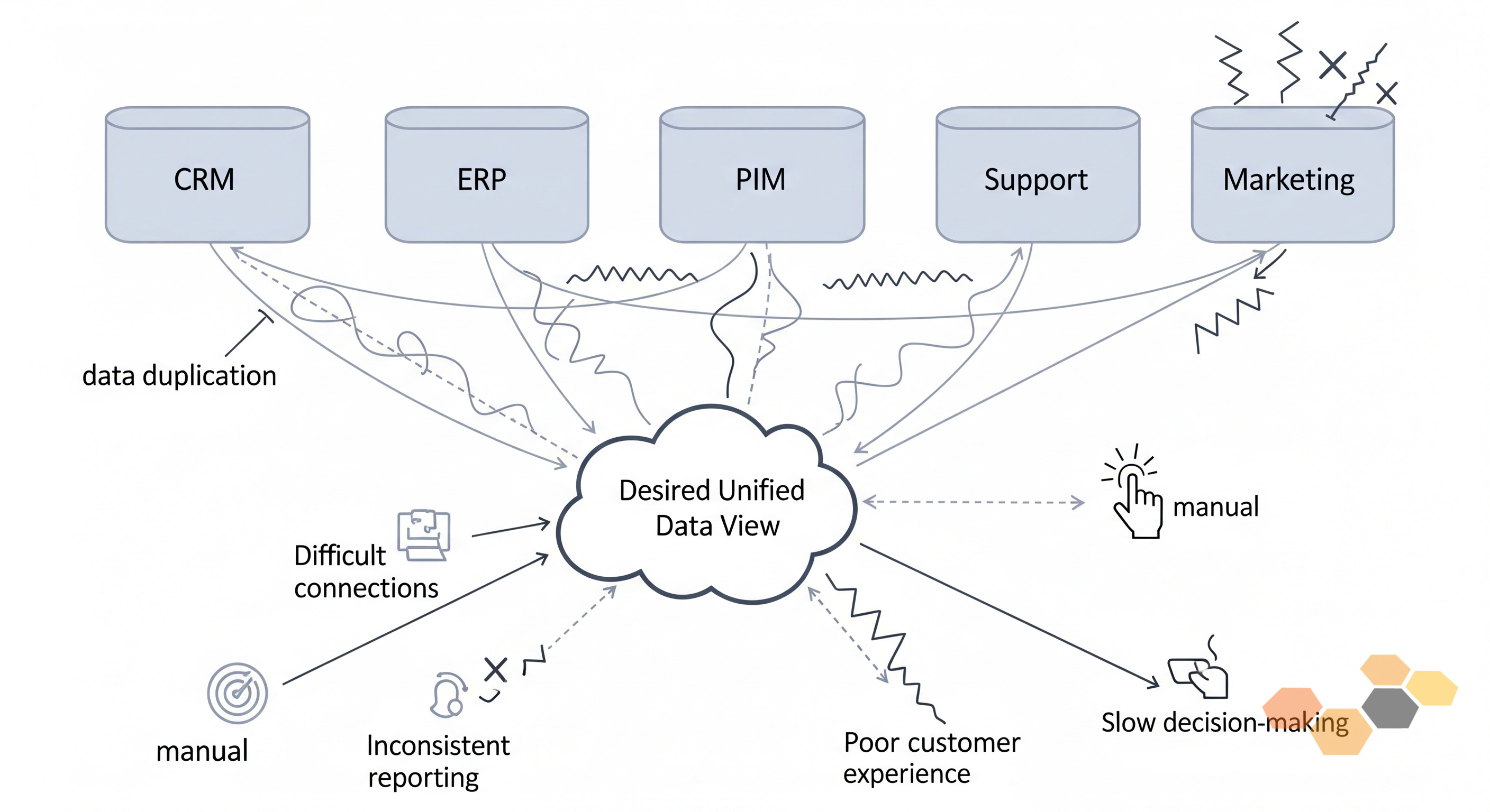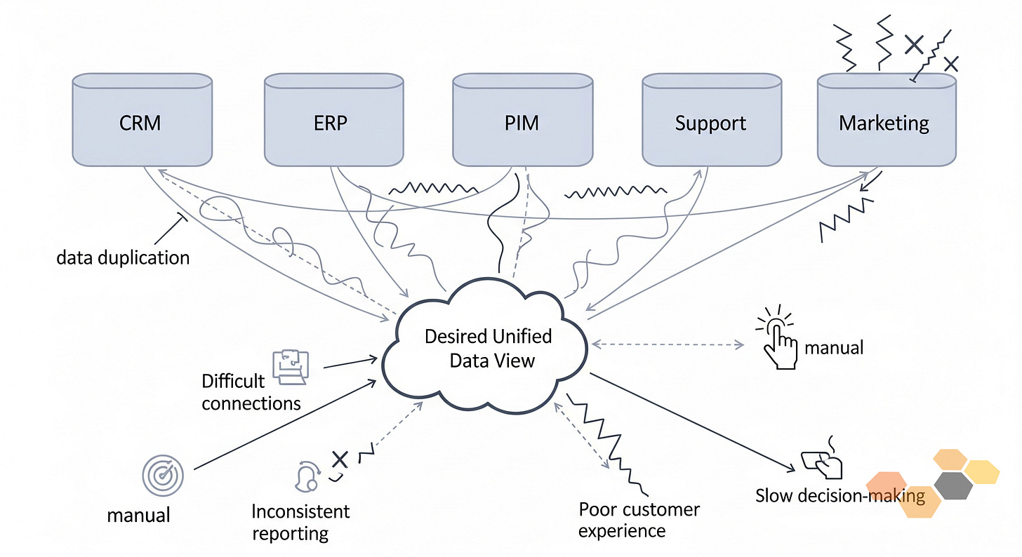 Picture this: your sales team meticulously updates customer interactions in the CRM. Meanwhile, your product team manages specifications and inventory in a separate PIM or ERP system. Support tickets, with their rich customer feedback, live in another database altogether. Marketing campaigns run on data that's yet another export from somewhere else.
