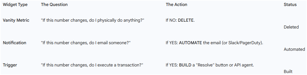 “Every chart on a dashboard represents a failure to define a business rule. If you know what to do when the line goes up, write the code to do it. If you don’t know what to do, stop watching the line.”