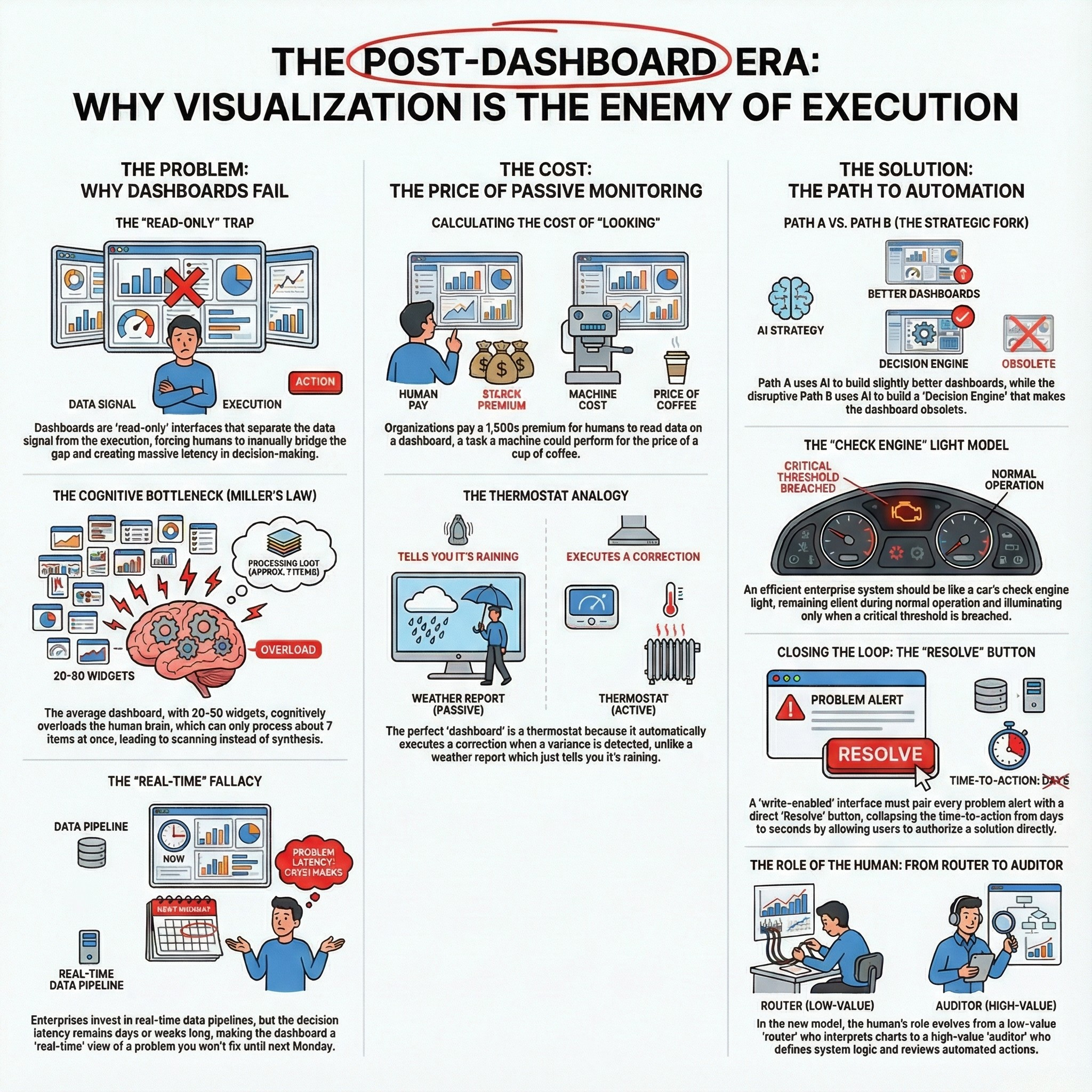 A dashboard is defined as a high-latency, read-only interface that relies on human cognitive processing to bridge the gap between a data signal and a business decision. It’s an “Administrative Artifact”—a tool that exists solely because the underlying system lacks the intelligence to resolve exceptions autonomously.