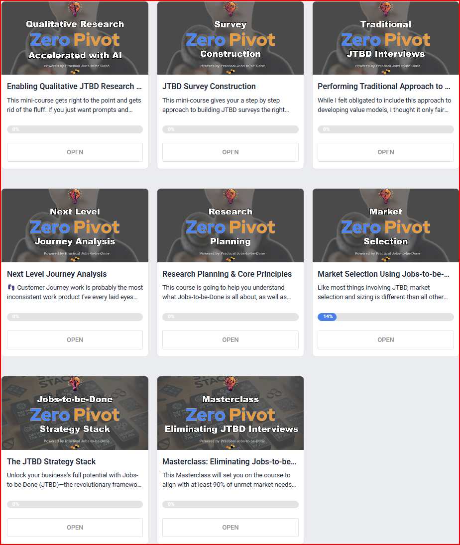 Before I dive in, I wanted to share something about my JTBD Masterclass. It’s not just a comprehensive course (with prompts) for eliminating JTBD interviews. You gain access to a community full of additional courses and toolkits. And this is growing. Just wait until you see the next one (I mean 6)!